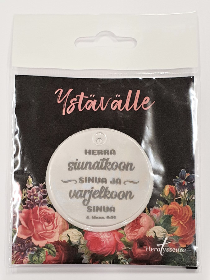 halkaisija 5 cm Sisältää narun ja hakaneulan.