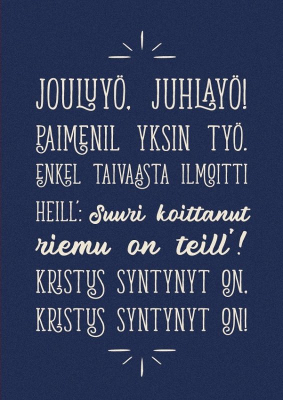 Jouluyö, juhlayö! Paimenil yksin työ. Enkel taivaasta ilmoitti heill’: Suuri koittanut riemu on teill’! Kristus syntynyt on, Kristus syntynyt on!