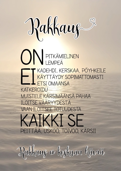Rakkaus on pitkämielinen, rakkaus on lempeä; rakkaus ei kadehdi, ei kerskaa, ei pöyhkeile, ei käyttäydy sopimattomasti, ei etsi omaansa, ei katkeroidu, ei muistele kärsimäänsä pahaa, ei iloitse vääryydestä, vaan iloitsee yhdessä totuuden kanssa; kaikki se peittää, kaikki se uskoo, kaikki se toivoo, kaikki se kärsii. Rakkaus ei koskaan häviä.