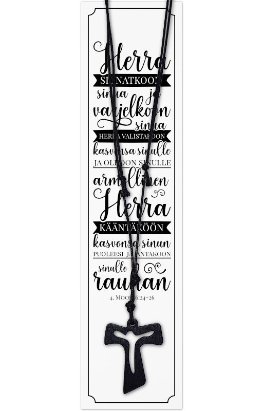 Kaunis puinen ristikaulakoru säädettävällä nauhalla. Koru on pakattu kauniiseen sellofaanipakkaukseen, jonka taustalla on Herran siunaus. Taustaa voi käyttää esimerkiksi kirjanmerkkinä. Ihana lahjaidea myös nuorille.