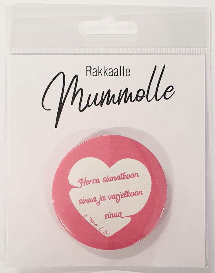 Ihana rintamerkki kauniissa pakkauksessa. Ilahduta mummoa pienellä lahjalla jolla toivotat hänelle Herran siunausta ja varjelusta.