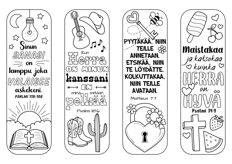 Leikkaa ja väritä omat uniikit kirjanmerkit. Sopii hyvin myös pyhäkoulujen, kerhojen ja lastentapahtumien askarteluksi. Kirjanmerkit on suunnitellut ja kuvittanut Pirjo Kamans. Suomalaista työtä ja taidetta. A5 kartonkiarkilla on neljä erilaista kirjanmerkkiä.